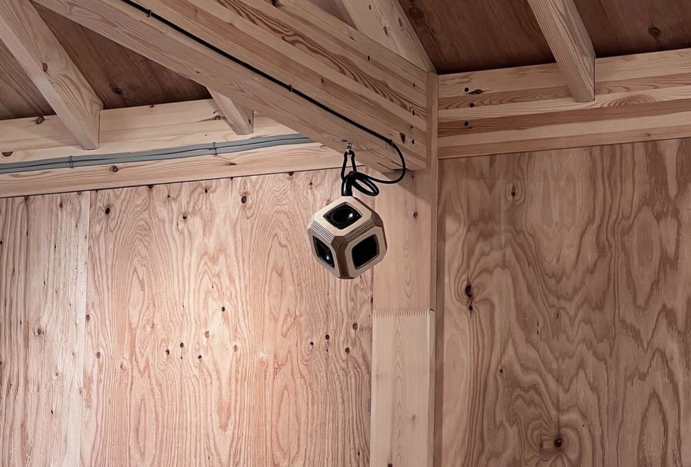 全面を木材で覆われた室内に「六面体スピーカー LIGHT」のデザインが馴染み、360度音に包まれる空間は、固くも柔軟性がある素材を扱われるA社様の強くも優しい社風が、空間デザイン、音響デザインで表現される心地よい場になっています。
