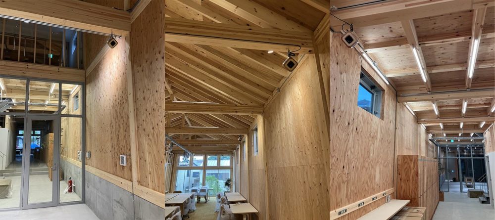 金属加工を中心としたモノづくりの会社にふさわしい天井高のある社屋に、エントランスから廊下、事務所まで、様々な場所に設置していただき、建物空間全体が音に包まれて構成になっています。