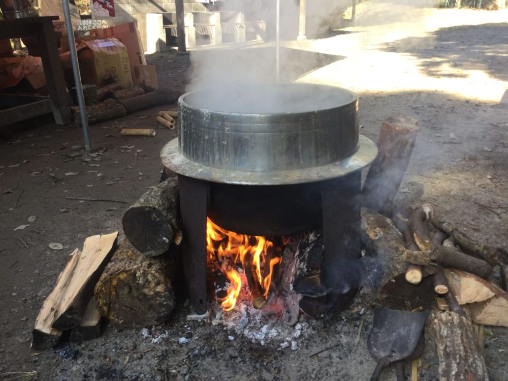 海辺でやる場合は、20リットルのポリタンクに10本分くらいの海水を汲んできて、薪にするための枯れ木を軽トラなどで運んできて、近くにある石や岩やブロックを組んで竈門を作ります。そして、竈門の上に大きな羽釜を置きます。