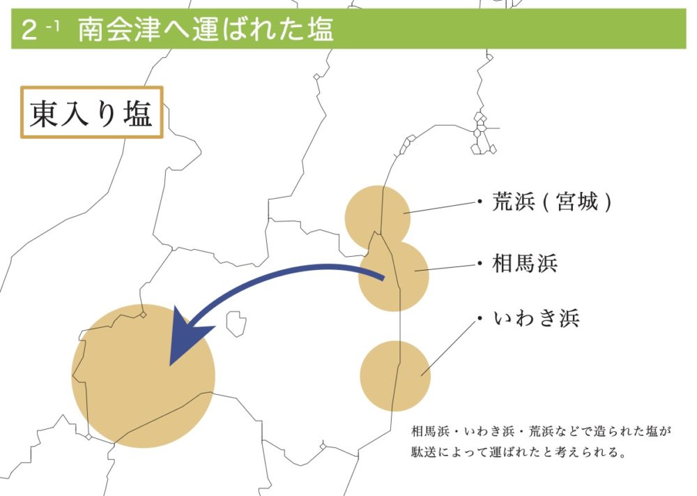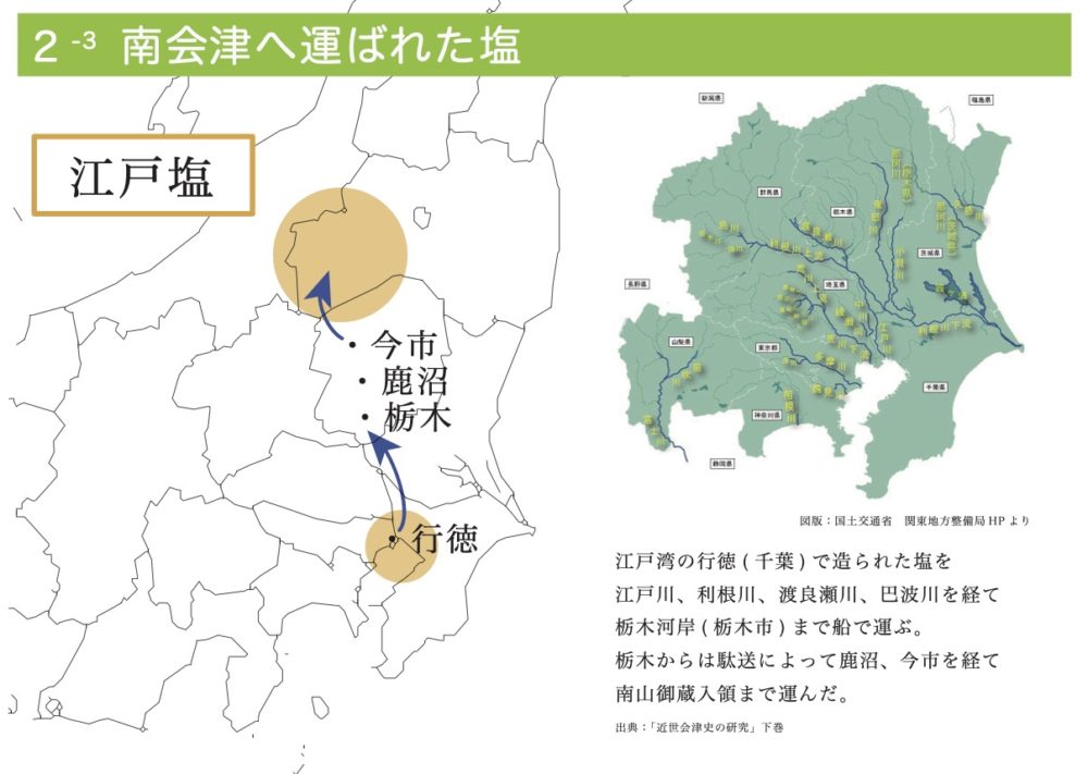 江戸湾で作られた塩は、江戸川、利根川、渡良瀬川、巴波川を辿って、栃木に入ってからは馬の背に乗せられて、会津に運ばれてきました。この塩は「江戸前塩」と呼ばれていました。